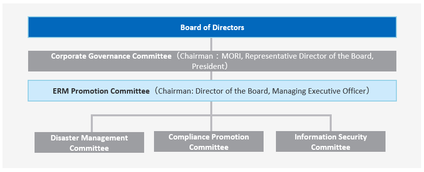 • ERM Promotion Committee:The Committee shares internal risk information, evaluates risks, identifies important risks, considers response policies, and reports and proposes policies for dealing with risks, as well as measures to prevent recurrence to the Director of the Board. The committee improves risk management awareness within the organization, primarily by adopting the policies determined within the organization, understanding the status of implementation, and providing education.